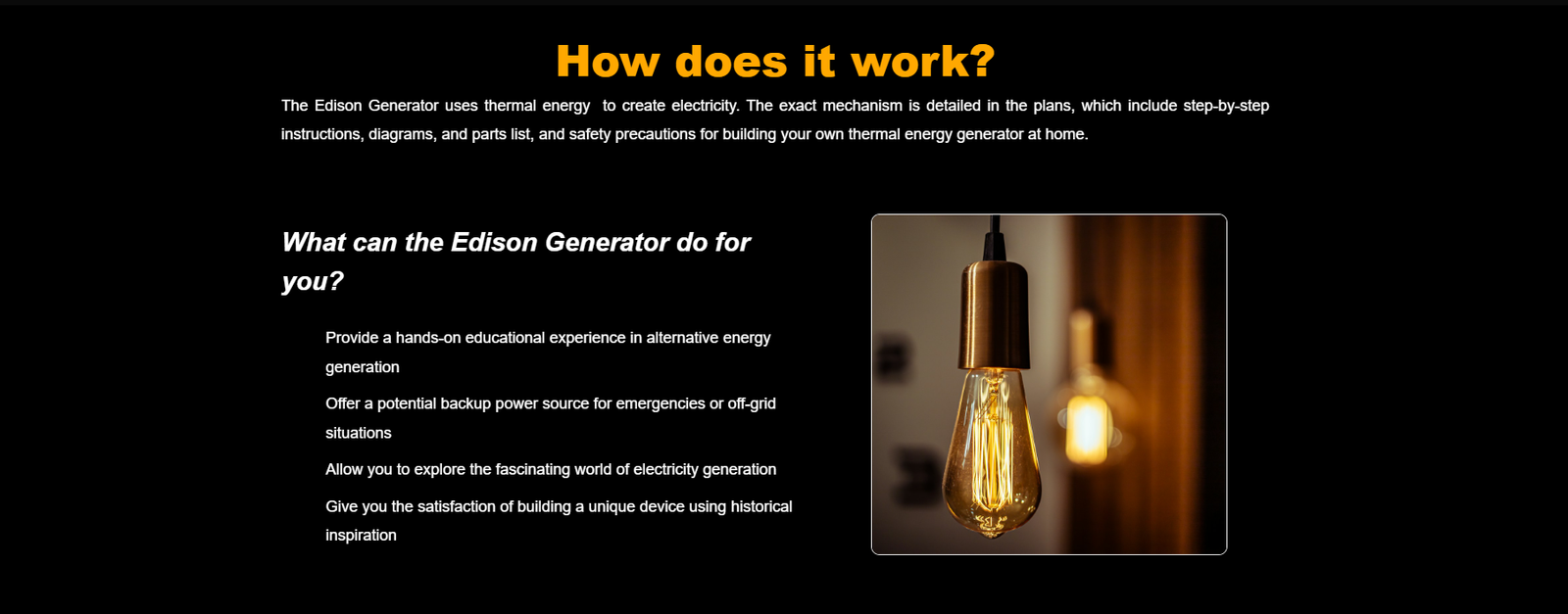 Disclaimer: It’s important to understand that the Edison Generator plans draw upon historical innovations and are provided for your enlightenment and personal development. Results can vary depending on individual execution and circumstances.